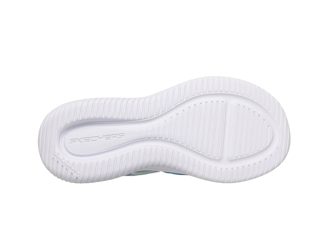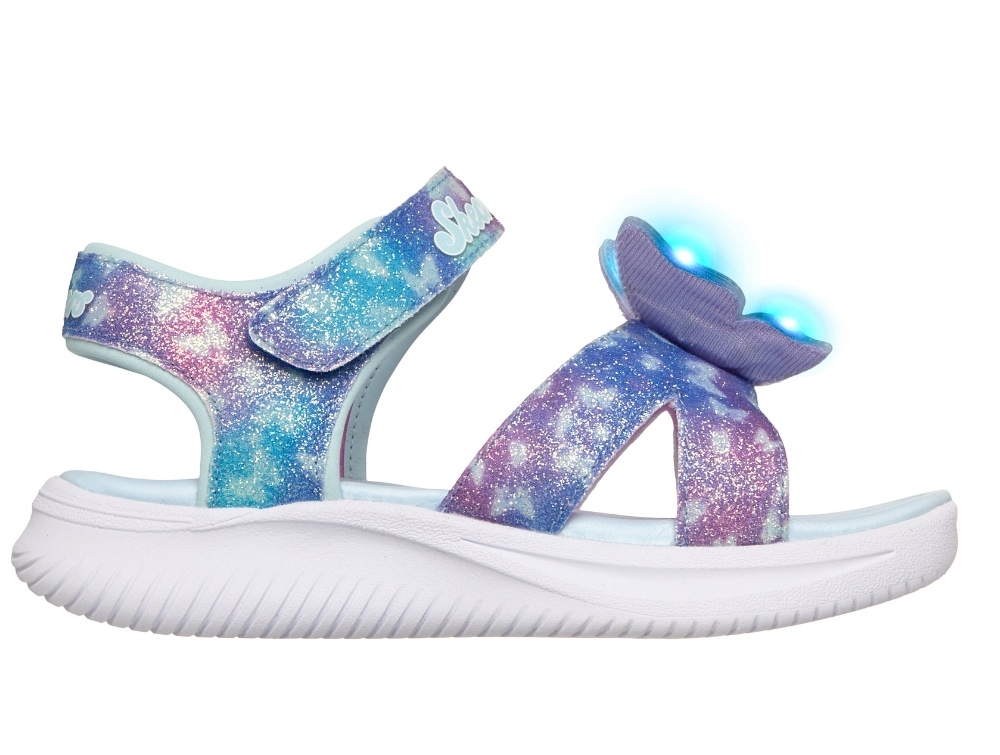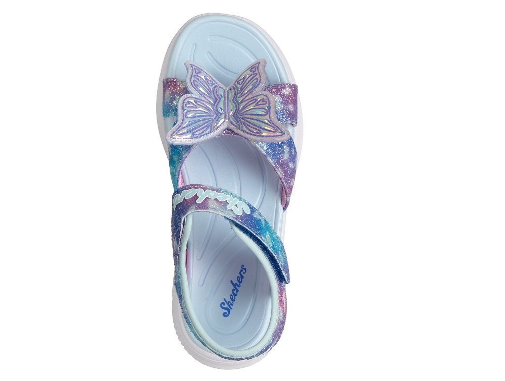 Sandal i blå nuancer med glimmer og farvespil fra Skechers med justerbare velcrostropper og lys i sålen. Modellen har en dekorativ sommerfugl på fronten, som lyser ved bevægelse og giver et farverigt udtryk.