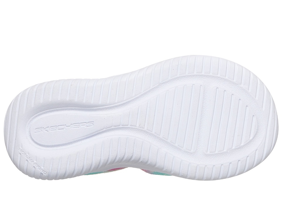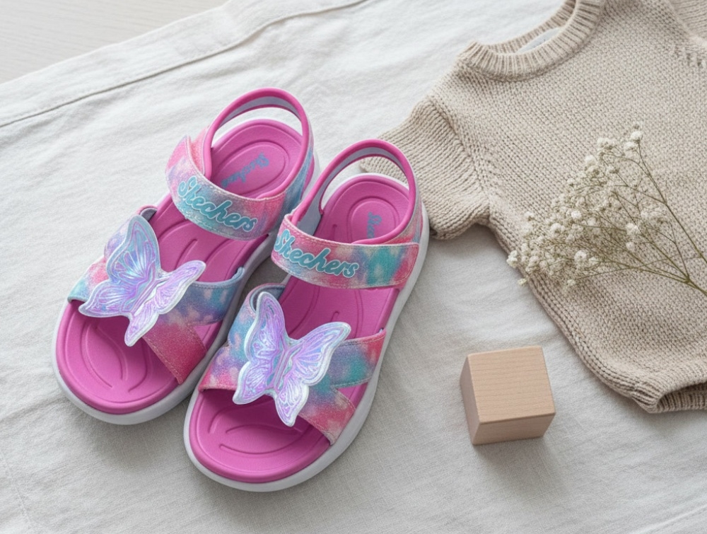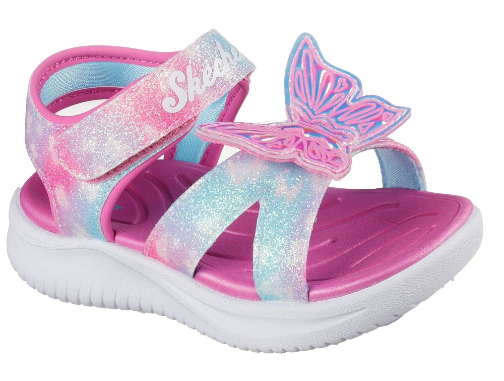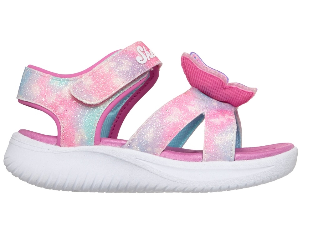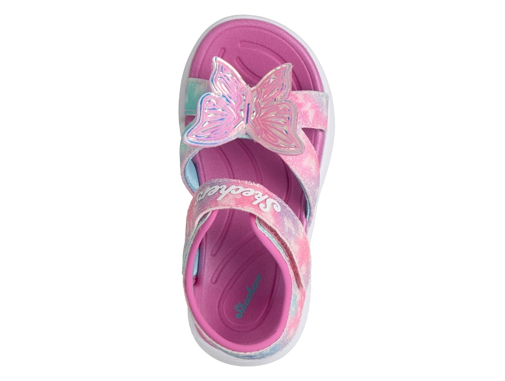 Sandal i pink nuancer med glimmer og farvespil fra Skechers med justerbar velcrostrop og lys i sålen. Modellen har en dekorativ sommerfugl på fronten, som lyser ved bevægelse og giver et farverigt udtryk.