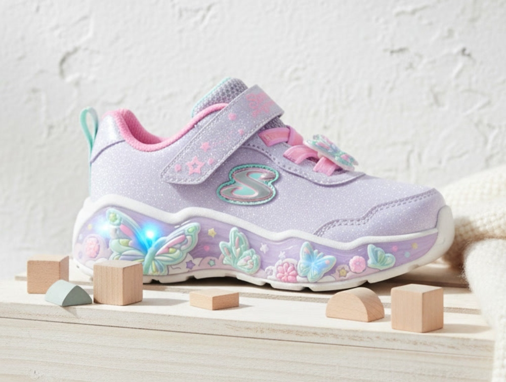 Skoen er udstyret med elastiske snørebånd og velcrorem over vristen, som gør den nem for børn at tage af og på. I mellemsålen ses sommerfuglemotiver med indbyggede lys, der aktiveres ved bevægelse og skaber et farverigt lysspil under leg. Den polstrede komfortindersål giver en behagelig følelse omkring foden, mens den fleksible ydersål giver stabilitet til leg og aktivitet i hverdagen.