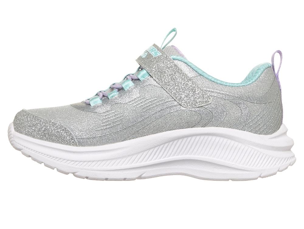 Sneaker i sølvglimmer nuance fra Skechers. Modellen Rainbow Cruisers – Glitzy Glow har en glimmer overdel i tekstil og en farverig mellemsål, der lyser op under leg og bevægelse. Det bløde mesh giver en let og fleksibel sko, mens de elastiske snørebånd og velcrorem gør den nem for børn at tage af og på.