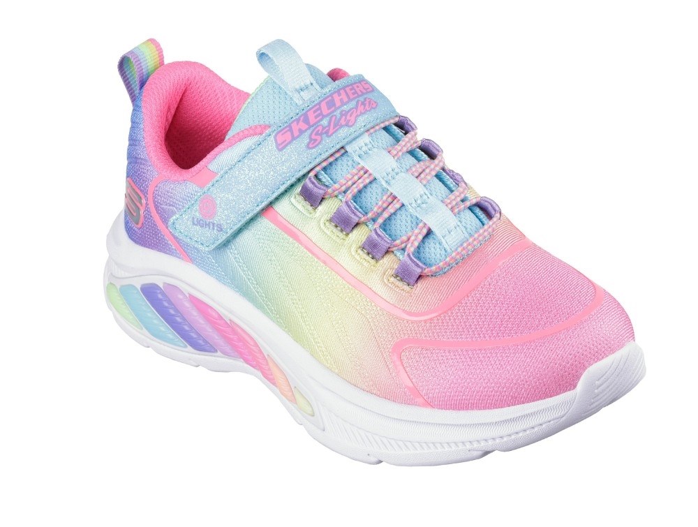 Sneakers i multifarvede regnbuenuancer fra Skechers med blinklys i sålen.