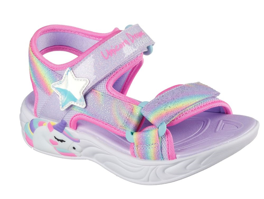 Let sandal fra Skechers i lilla og pink med glimmereffekt, regnbuefarvede remme og en skulptureret enhjørning i sålen.