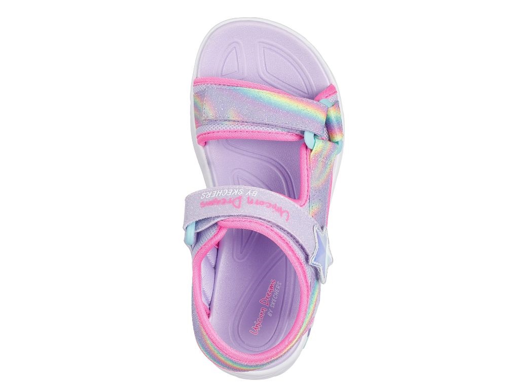 skechers sandal i lilla og pink med glimmer og regnbuefarvede remme, set fra sidenskechers sandal i lilla og pink med enhjørning og velcrolukning, set skråt forfraskechers sandal med glimmer og velcrolukning, set oppefra
