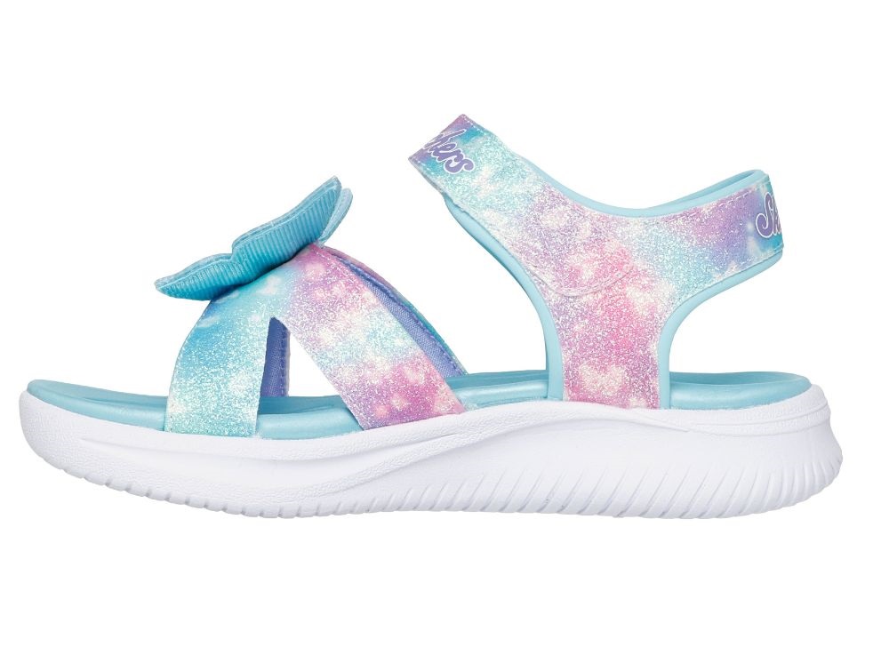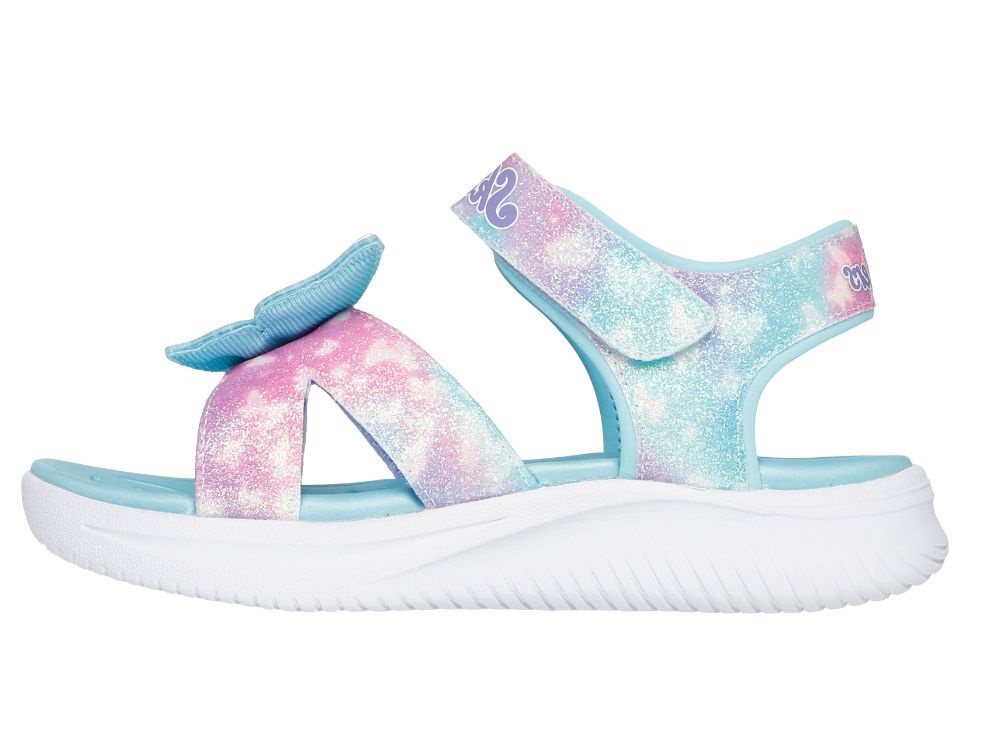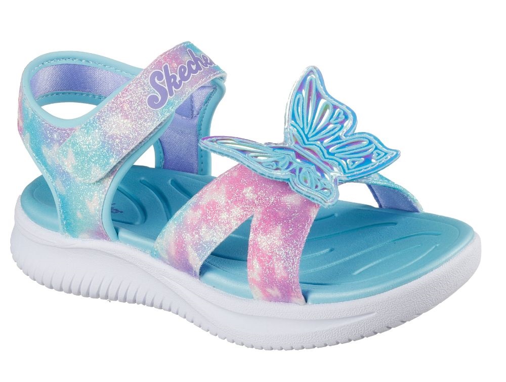 skechers sandal i turkis med glimmer og sommerfugl på remmen, set fra sidenskechers sandal i turkis og pink med glimmer og 3D sommerfugl, set skråt forfraskechers sandal med glimmer og lys sål, set fra indersidenproduktlabel på skechers butterfly sandal i turkis, close-up billede