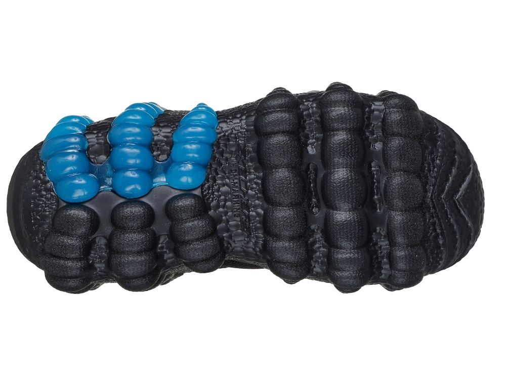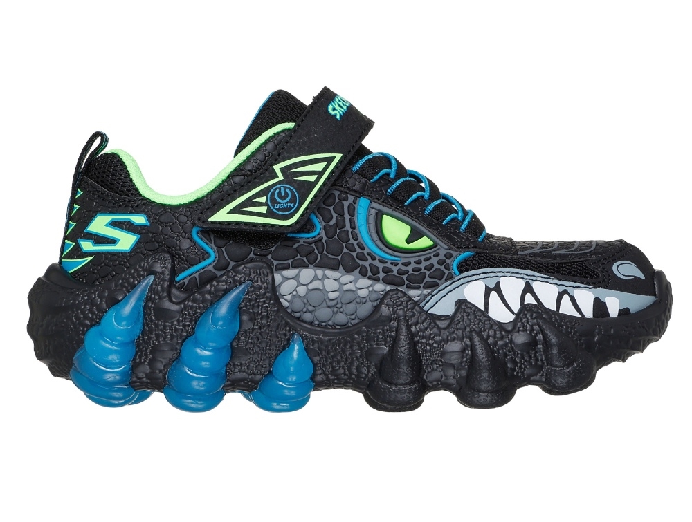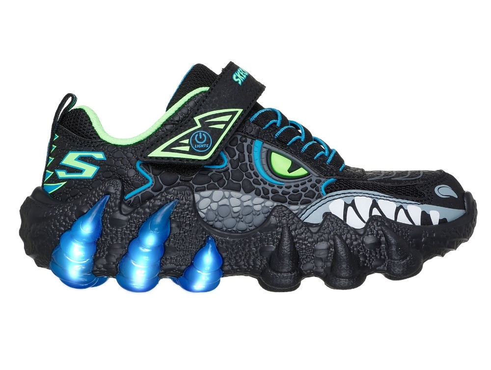 Skoen er designet med en dramatisk sål formet som dinosaurkløer, der lyser ved bevægelse og kan tændes og slukkes på en knap på velcroremmen. Den kombinerer elastiske snørebånd med en velcrorem, så den er nem at tage af og på. Den stødabsorberende mellemsål giver komfort til leg og aktivitet, mens den fleksible ydersål giver godt greb.