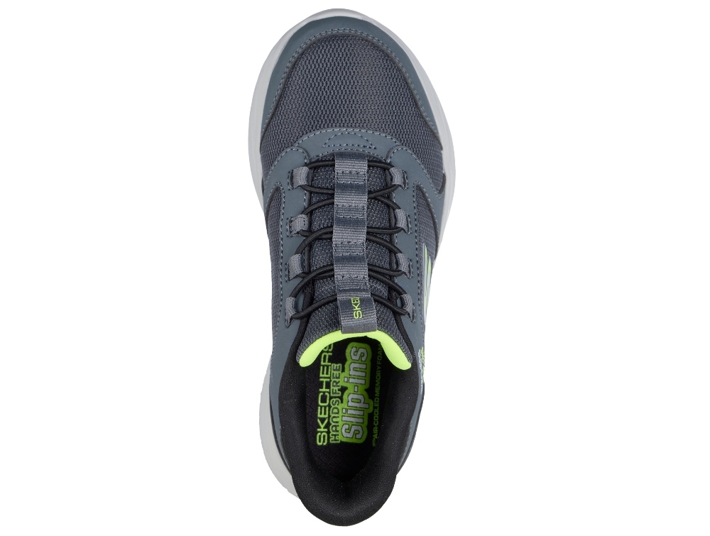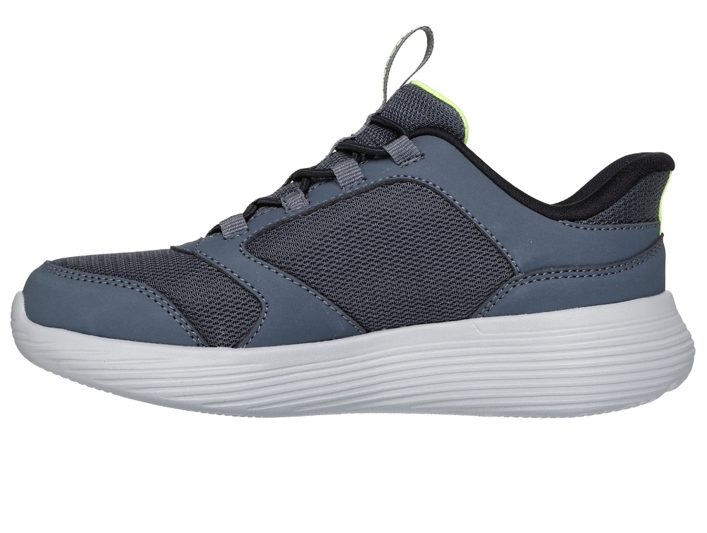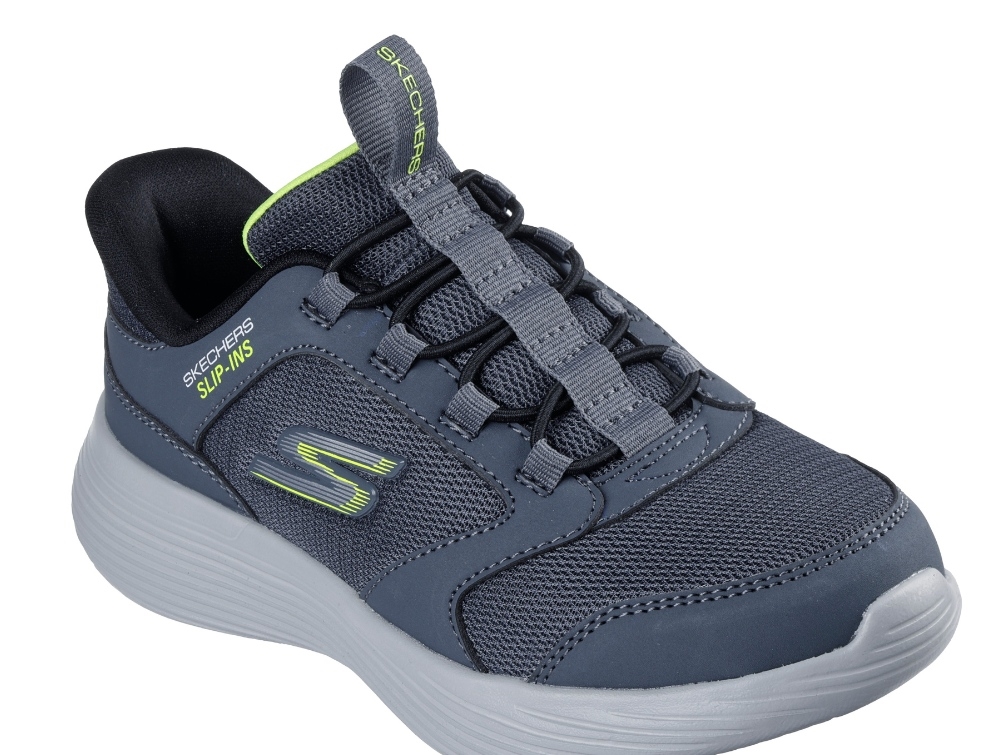 Skechers Slip-ins sneaker til børn i grå med neongule detaljer. Modellen har en let overdel i mesh og syntetisk materiale samt faste elastik-snørebånd, der gør den nem at få på.