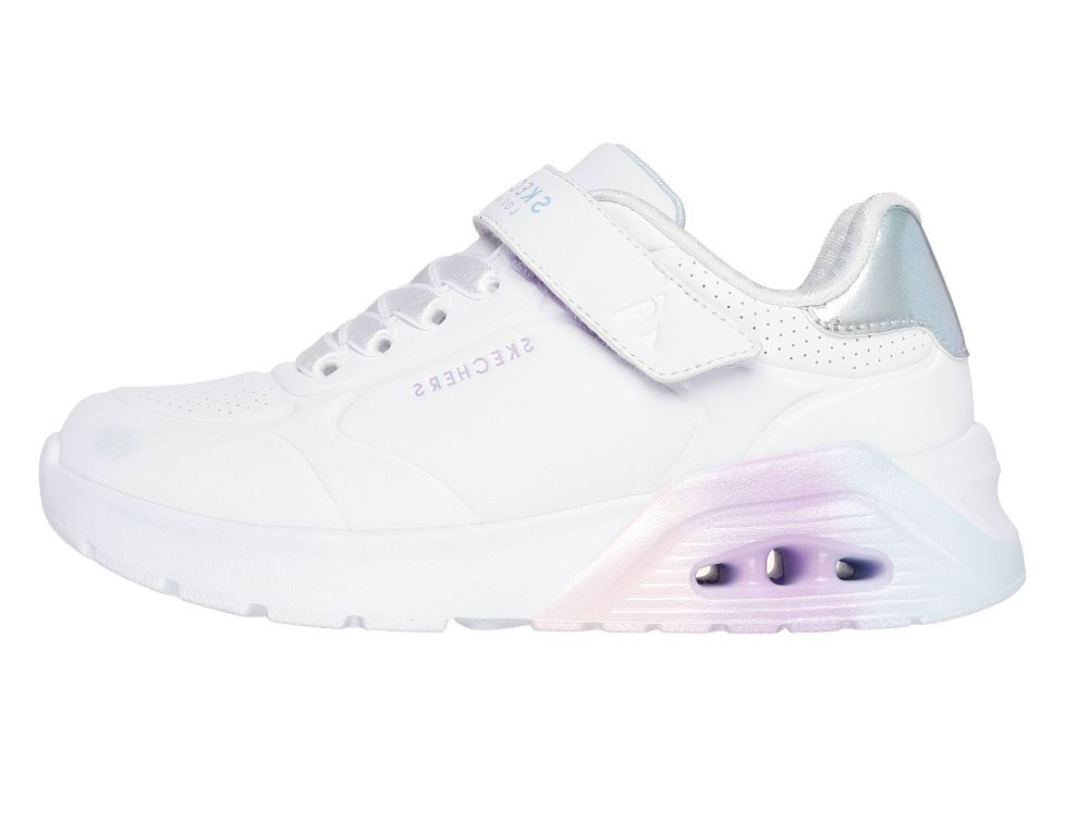 skechers sneaker i hvid med metallic detaljer og air cushion, set fra sidenskechers uno lite sneaker i hvid med lilla sål og velcrolukning, set skråt forfra