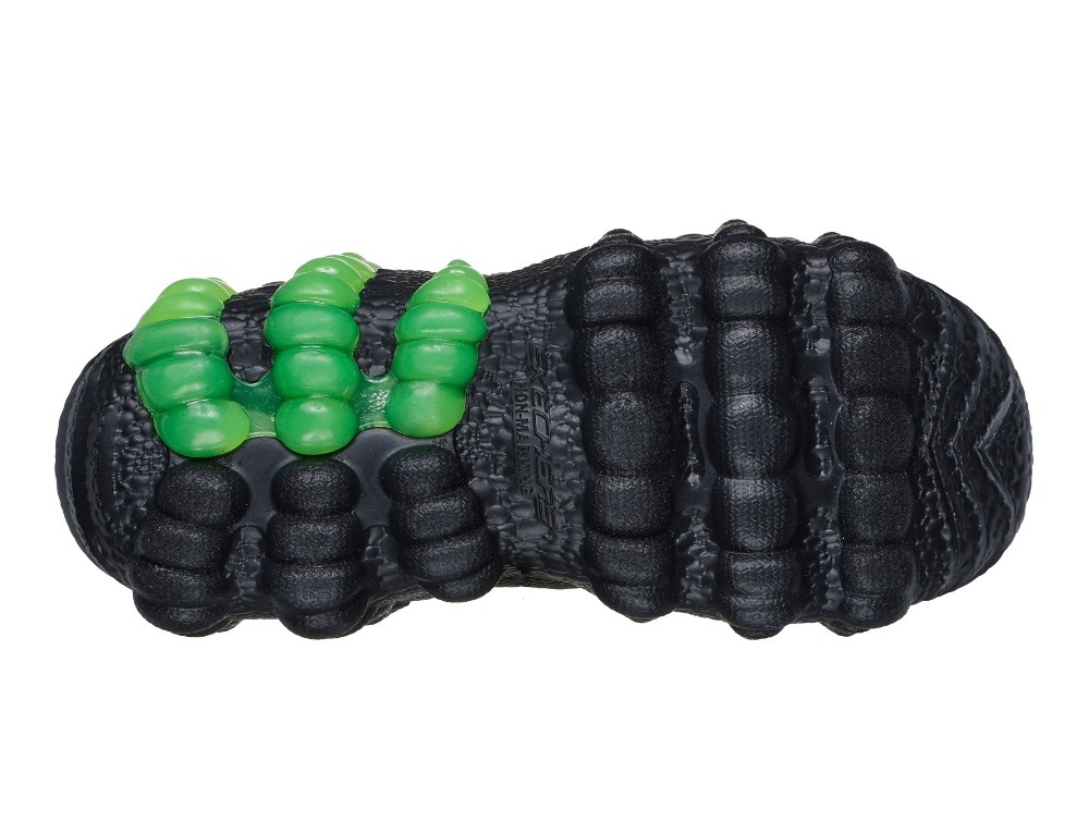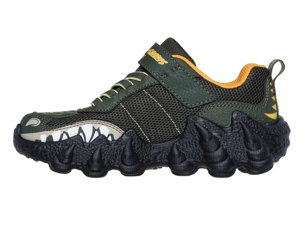 Uhyggelige dinosaurus sneakers i sorte, grønne og orange nuancer med mange detaljer fra Skechers.
