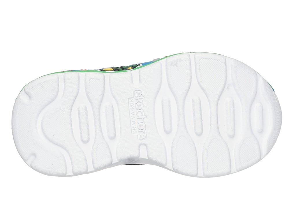 Sneaker i grøn og sort farvekombination fra Skechers med sjove gårdmotiver og traktor-detaljer. John Deere tema-skoen er designet til aktive børn, der elsker maskiner, bondegårde og fyr, og kombinerer let komfort med et farverigt univers langs mellemsålen.