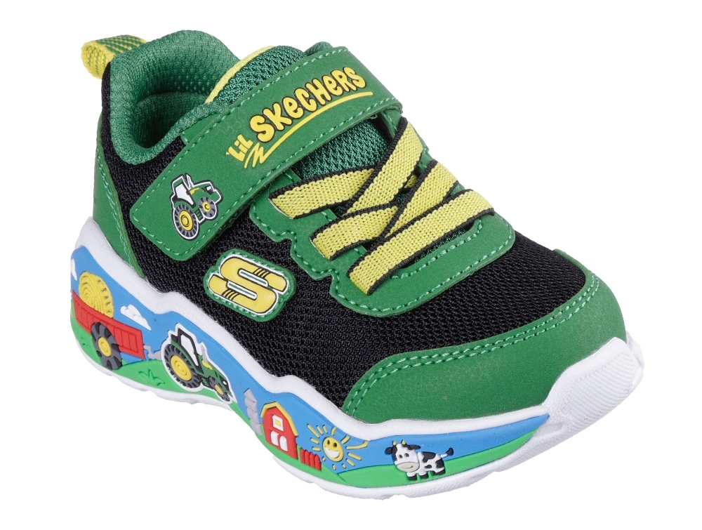 Skechers John Deere sneaker grøn/sort med gårdmotivSkechers John Deere sneaker grøn/sort med gårdmotiv set oppefraSkechers John Deere sneaker grøn/sort med gårdmotiv sålSkechers John Deere sneaker grøn/sort med gårdmotiv set skråt fra sidenSkechers John Deere sneaker grøn/sort med gårdmotiv set fra siden