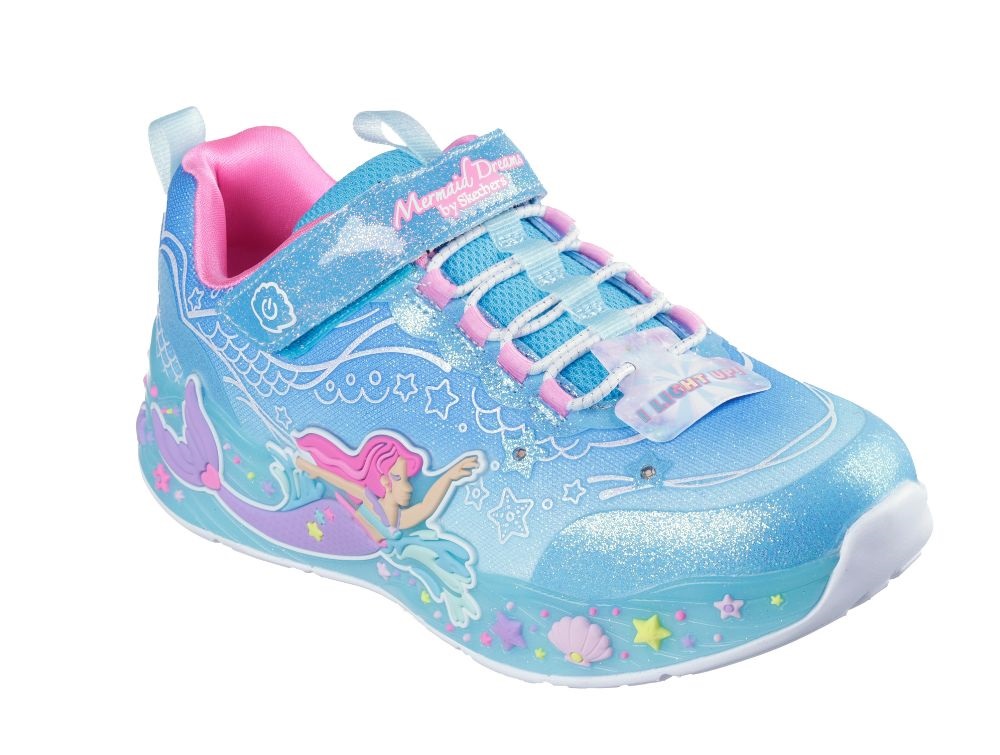 Blå sneakers med glimmer og havfrue applikation fra Skechers med blinklys i sålen, som aktiveres ved bevægelse.
