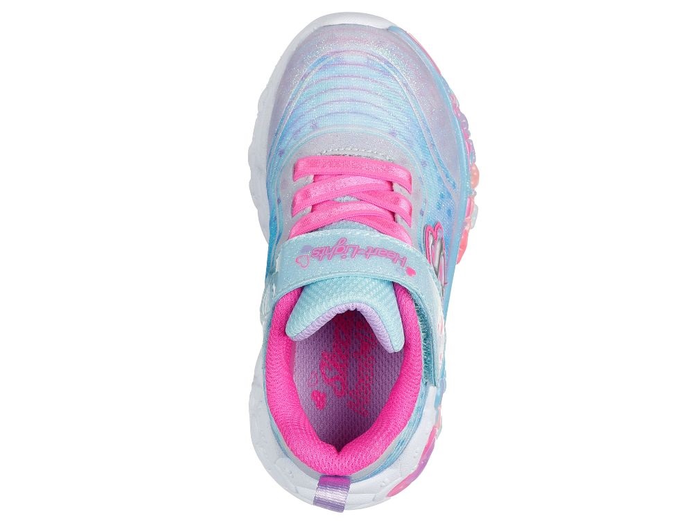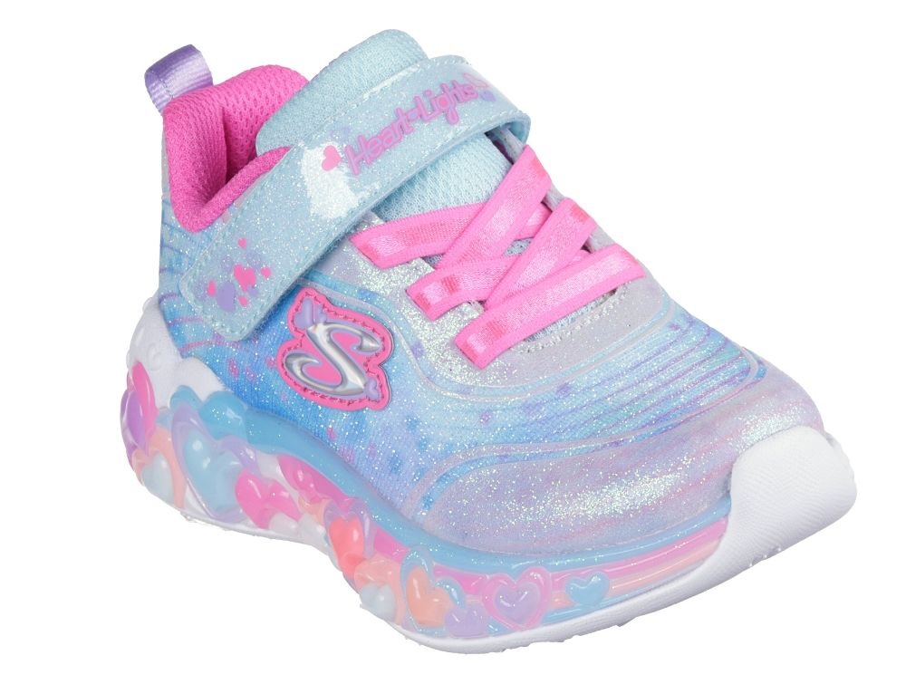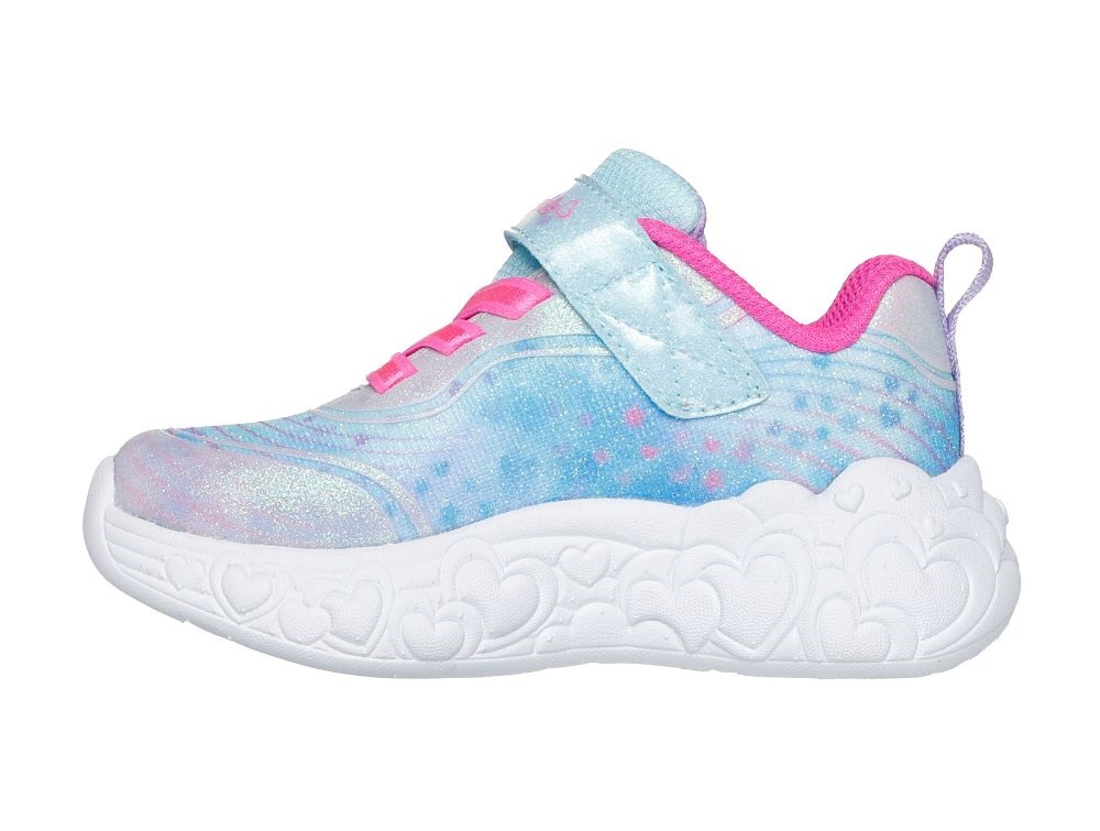 Lyseblå sneakers med glimmer, pink deltaljer og hjerter fra Skechers.