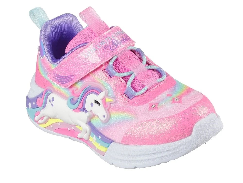 Pink sneakers med multifarvede detaljer, glimmer og enhjørning-applikation fra Skechers.