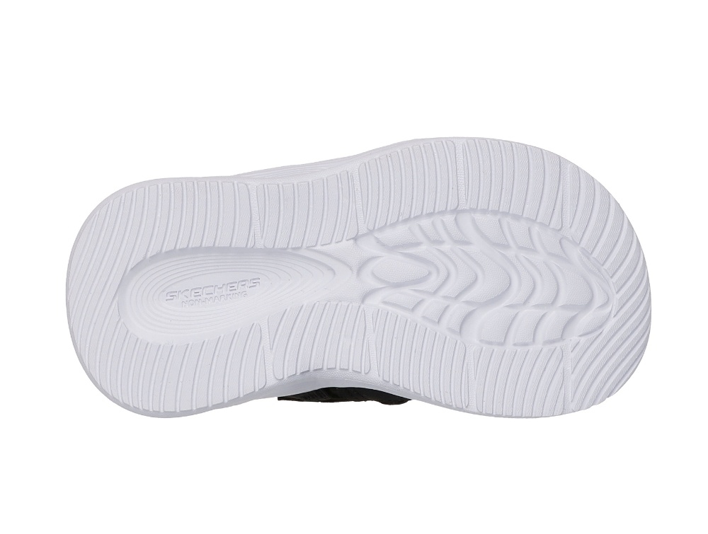 Sandal i sort nuance med grønne detaljer fra Skechers med lukket tå, elastiksnøre og justerbar velcrolukning. Modellen har lys i sålen, som aktiveres ved bevægelse og giver et sporty og iøjnefaldende udtryk.