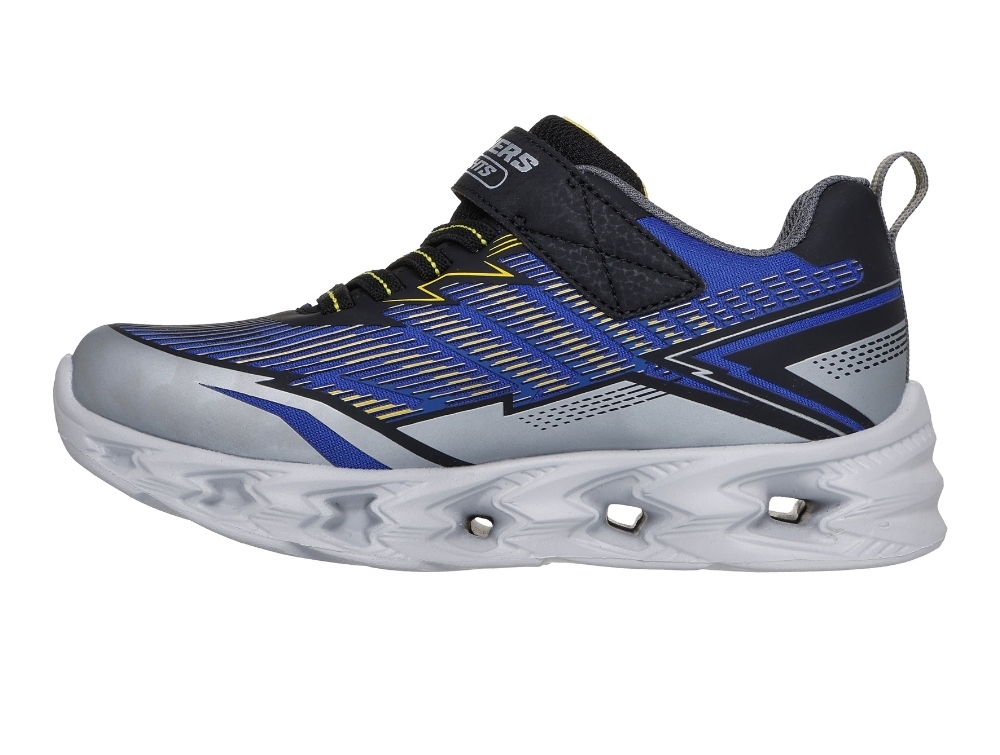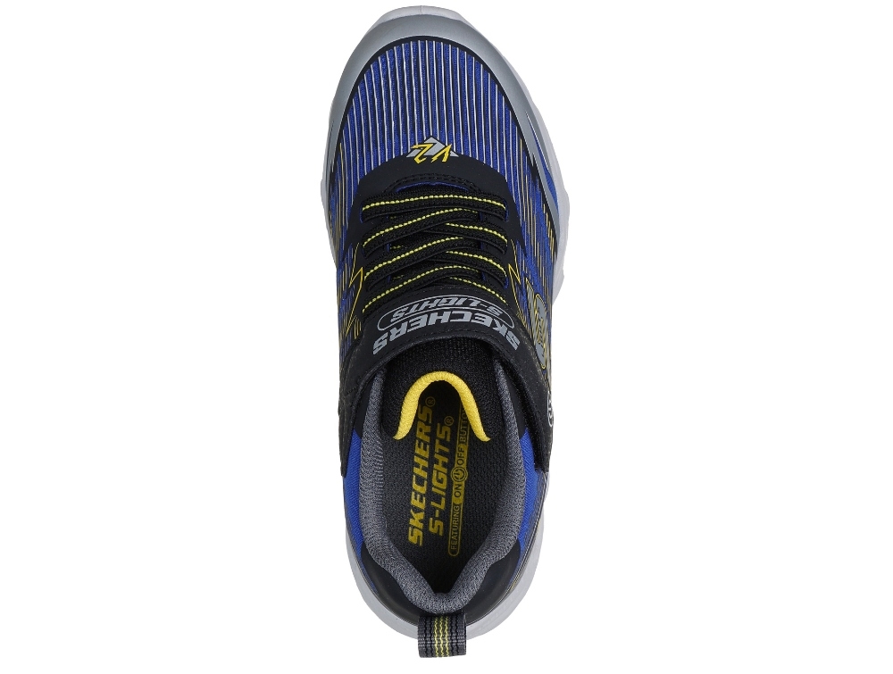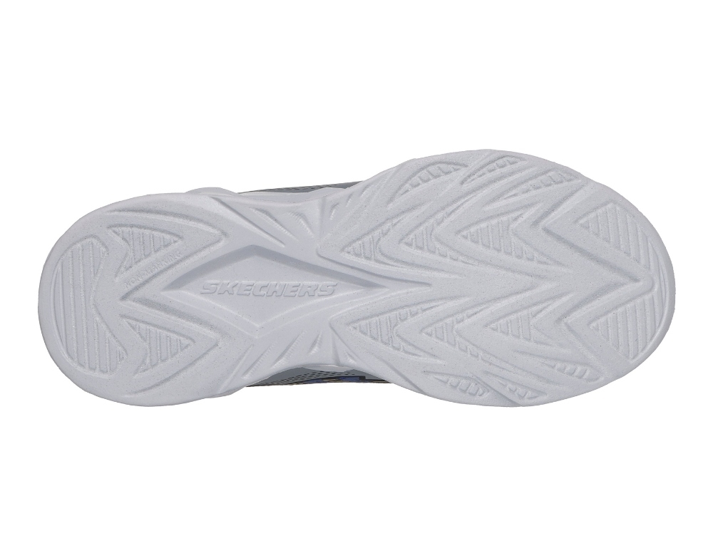 Skechers S-Lights® Vortex 2.0 - Veltrox sneakers i sølv, sort og blå med blinklys i sålen. Blinklyset aktiveres, når skoene bevæges, og kan tændes eller slukkes via knap på velcroremmen. Modellen har elastik over vristen og justerbar velcrolukning, der gør den let at tage af og på.