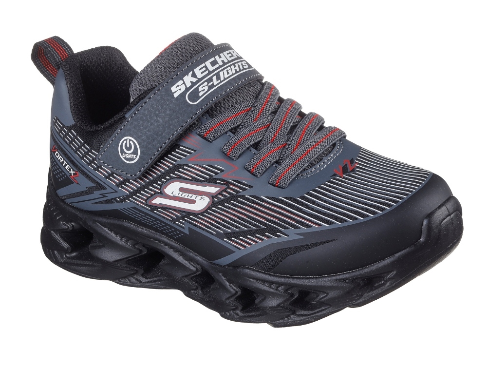 Skechers S-Lights® Vortex 2.0 - Veltrox sneakers i sort, grå og rød med blinklys i sålen. Blinklyset aktiveres, når skoene bevæges, og kan tændes eller slukkes via knap på velcroremmen. Modellen har elastik over vristen og justerbar velcrolukning, der gør den let at tage af og på.
