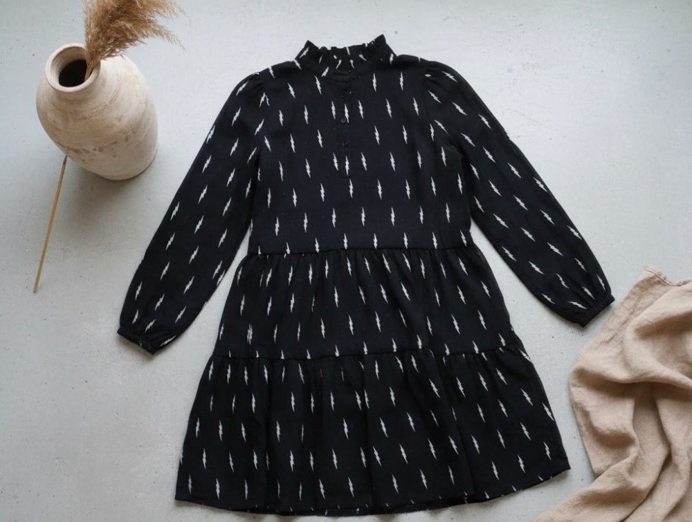 Kjolen har fire knapper på ryggen, elastik ved ærmeslut og et sort underskørt.