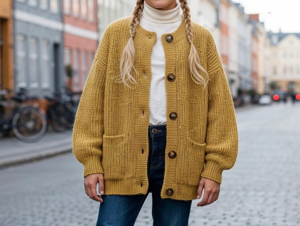 Strikcardigan i farven dusty yellow med glitter, lommer og knapper fra Sofie Schnoor Girls.