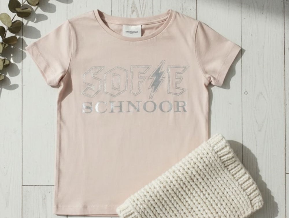 Rosa t-shirt med sølvfarvet print fra Sofie Schnoor Girls.