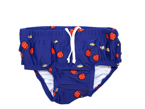 Blå badebukser med kirsebærprint fra Soft Gallery. Badebukser har elastik i linningen med snøre og flæser bagpå.