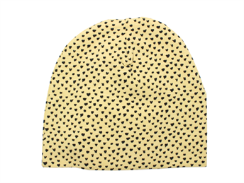 Gul beanie med sort mini hjerte-print fra Soft Gallery. Produceret i 96% bomuld og 4% elastan.