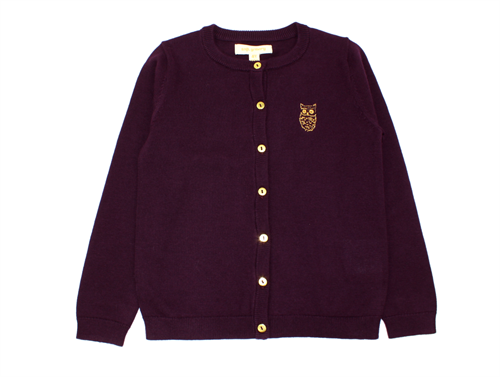 Strik cardigan i farven fig ( mørk lilla) med guldfarvet ugle fra Soft Gallery.