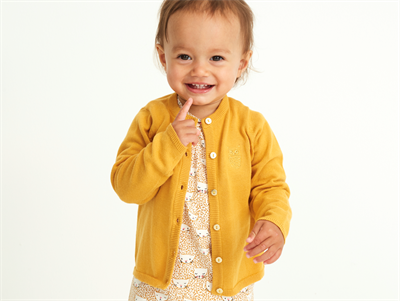 Strik cardigan i farven golden glow med guldfarvet ugle fra Soft Gallery.