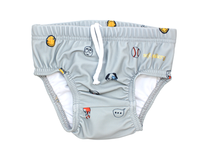 Badebukser i farven alloy (grå) med 'emojo'-print fra Soft Gallery. Badebukserne har elastik i taljen og UV beskyttelse på 50+.