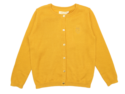 Strik cardigan i farven golden glow med guldfarvet ugle fra Soft Gallery.