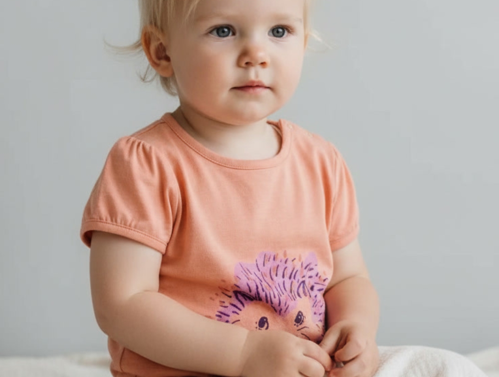 Kortærmet t-shirt i farven tawny orange med pindsvin-print fra Soft Gallery.