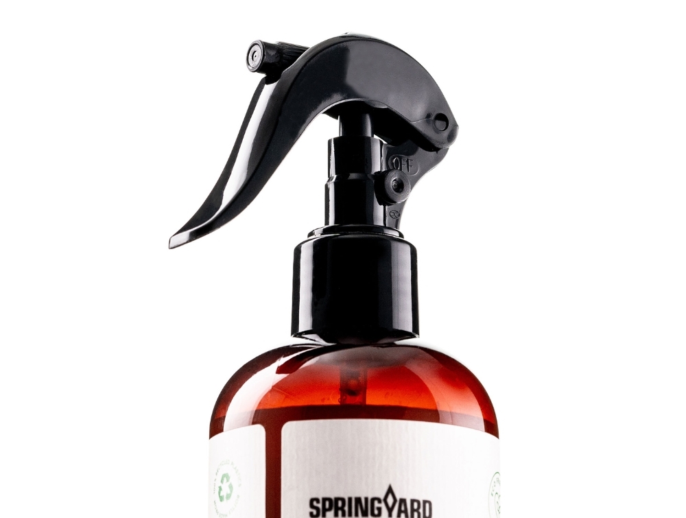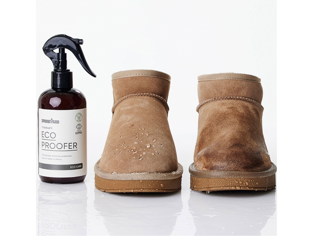 Springyard Eco Proofer vandbaseret imprægneringsspraySpringyard Eco Proofer vandbaseret imprægneringsspray vist med skoeksempelSpringyard Eco Proofer bagside med produktinformation og brugsanvisningSpringyard Eco Proofer sprayhoved i sort plast