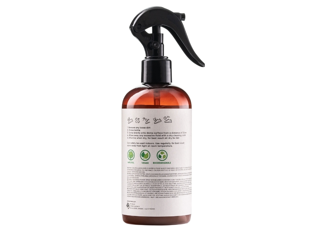 Sprayen er velegnet til læder, tekstil, ruskind, nubuck, syntetiske materialer og funktionstekstiler. Den beskytter uden at påvirke materialets åndbarhed og kan bruges både på sko, tøj og tasker. Flasken er fremstillet af 100% genanvendt plast og produktet er PFAS-frit.