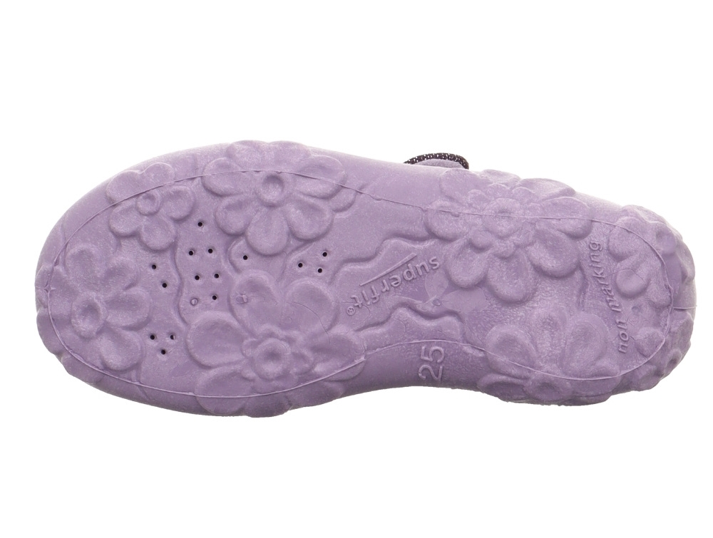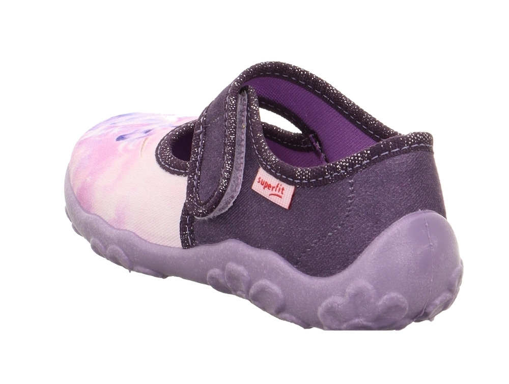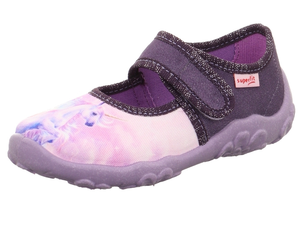 Hjemmesko i lilla tekstil fra Superfit med flot enhjørningemotiv på fronten. Modellen BONNY er designet med en fleksibel letvægtssål i blomstermønster, som giver barnet komfort og bevægelsesfrihed.