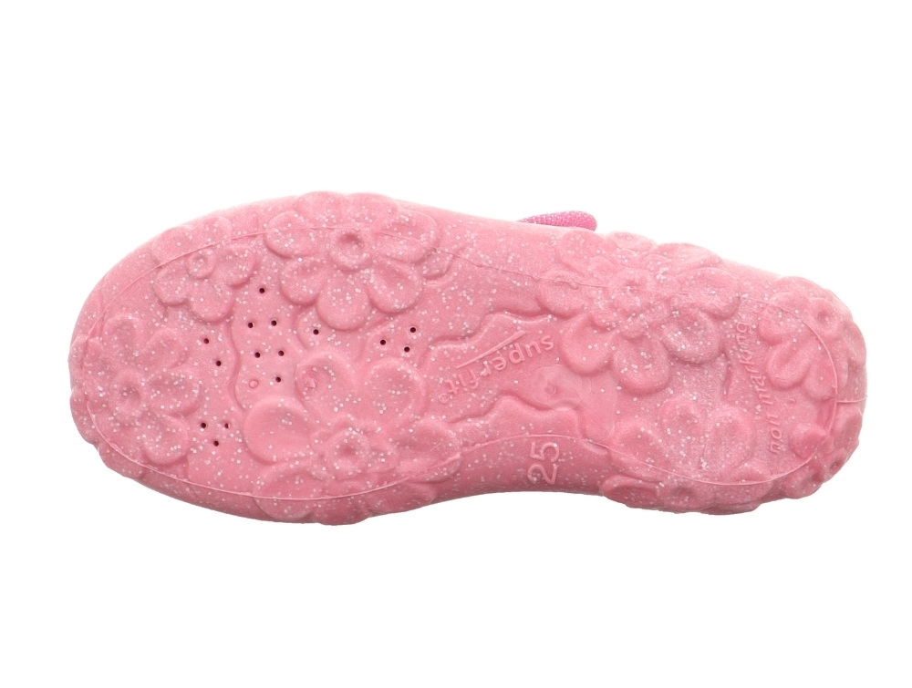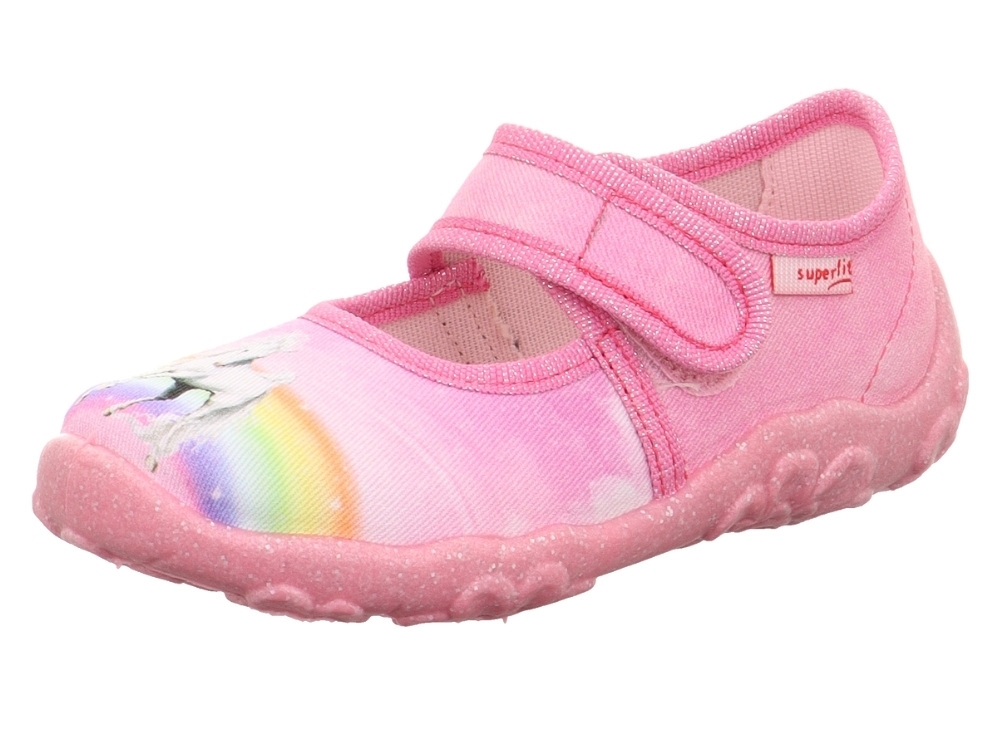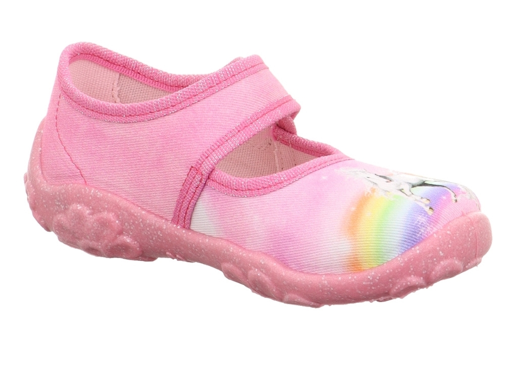 Hjemmesko i rosa tekstil fra Superfit med sødt enhjørningemotiv og farverig regnbue. Modellen BONNY har en fleksibel letvægtssål med blomstermønster, som giver barnet komfort og bevægelsesfrihed. Særligt velegnet til brug i vuggestue og børnehave.