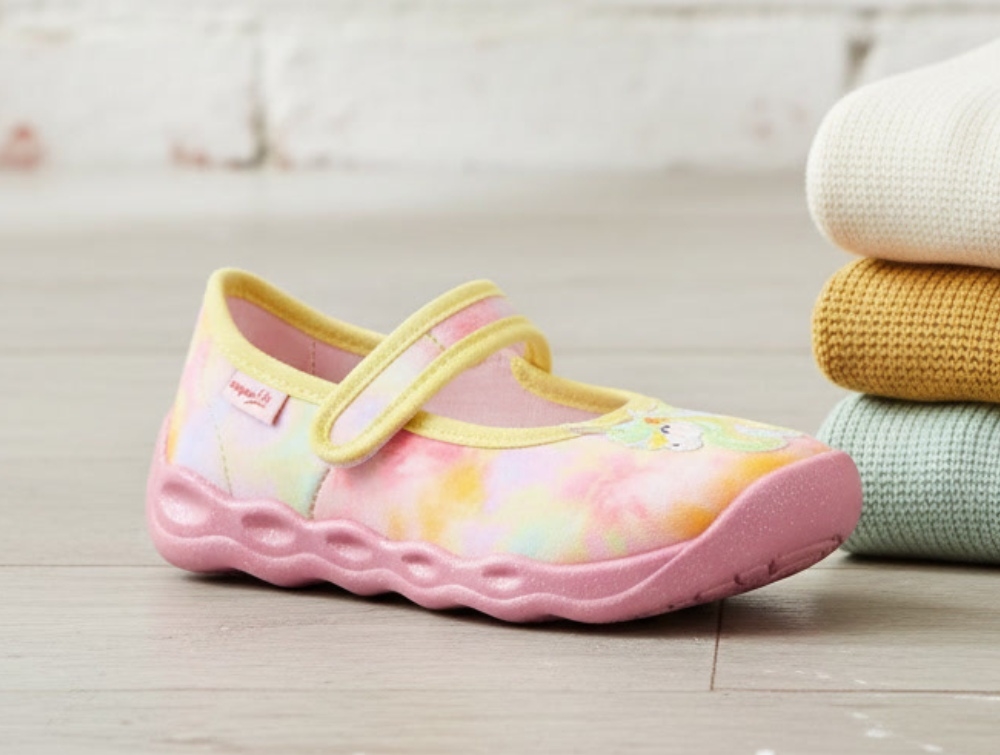 Tekstilhjemmesko/ballerinaer i gul og rosa farvetema fra Superfit.