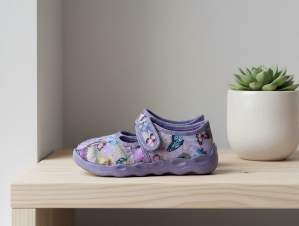 Hjemmesko i lilla nuance med fint sommerfugleprint fra Superfit – modellen Bubble er en let og fleksibel sutsko i tekstil.