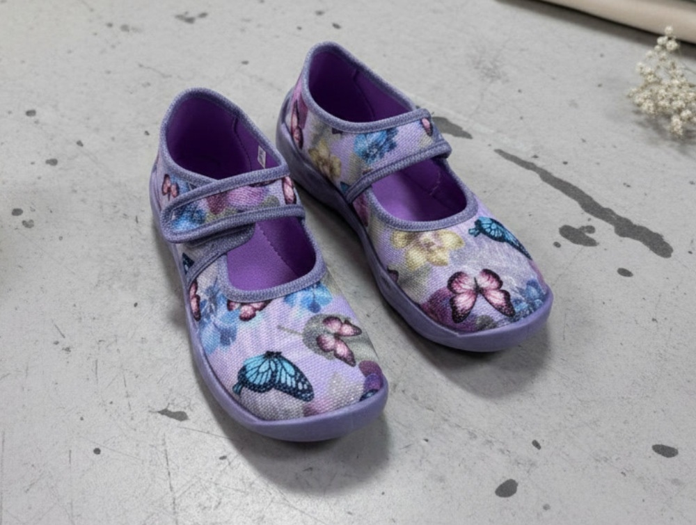 Den bløde tekstiloverdel former sig behageligt om foden, mens den lette PVC-sål giver fleksibilitet og bevægelsesfrihed. En velcrorem over vristen gør modellen nem at tage af og på og sikrer en god pasform.