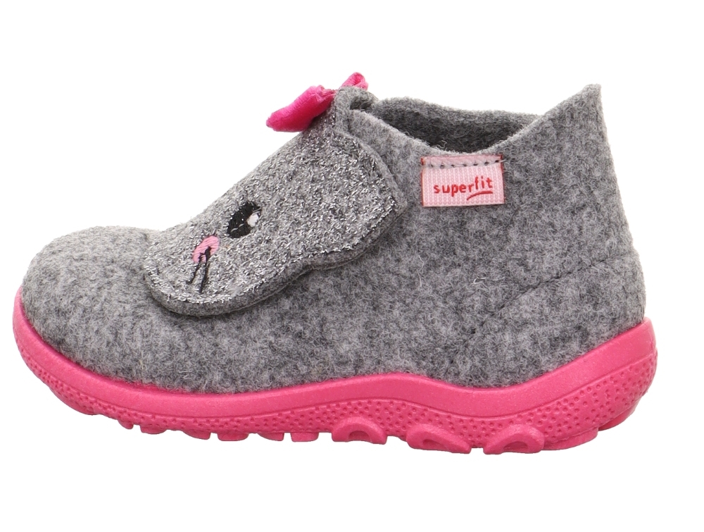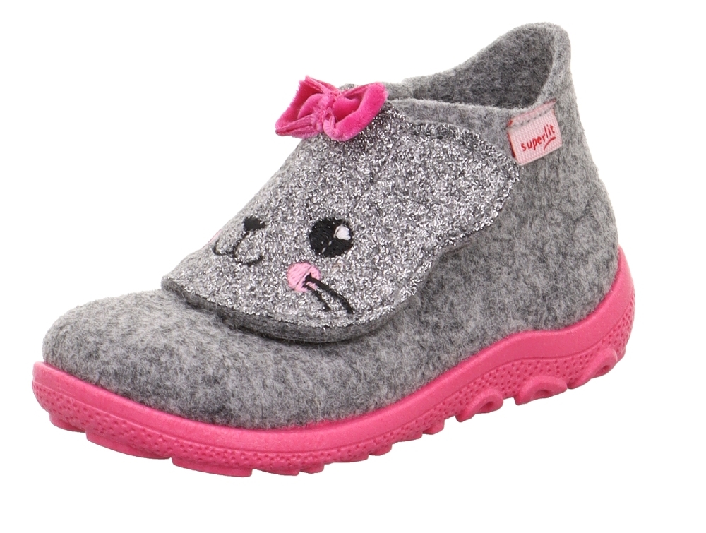 Grå hjemmesko i uldfilt fra Superfit med sød katteapplikation i glimmer og pink detaljer. Hjemmeskoene har en fleksibel pink letvægtssål, der giver godt greb på indendørs underlag, og de lukkes nemt med en praktisk velcrorem.