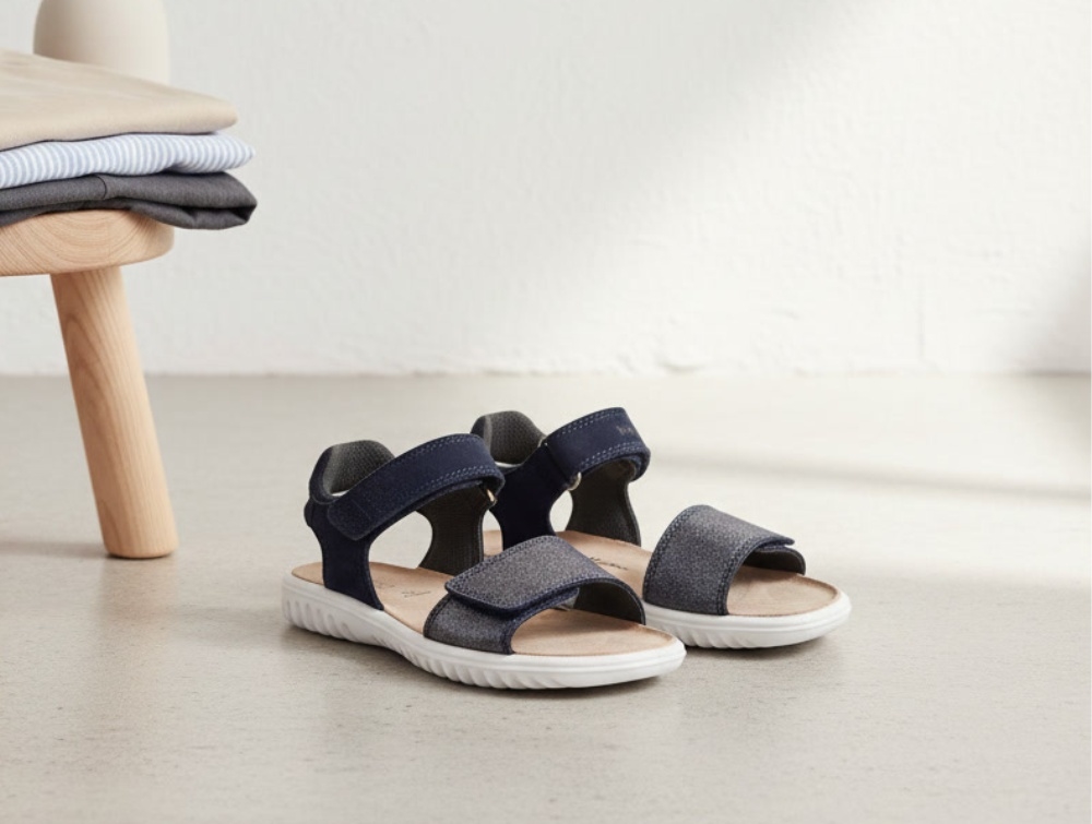 Sandal i blå nuance fra Superfit med glimmerdetaljer på forfoden og en blød opbygning omkring hælen. Modellen kombinerer et enkelt look med et diskret skinnende udtryk.