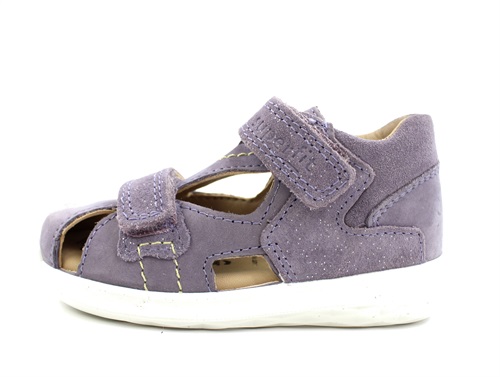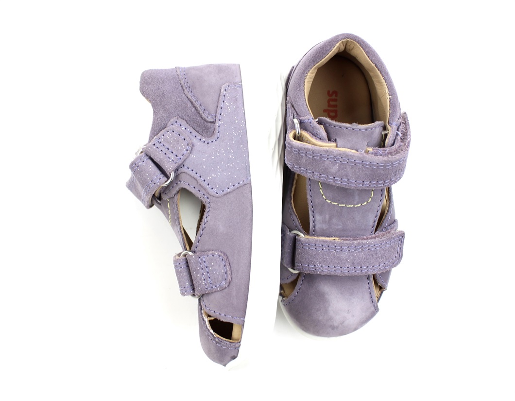 Lilla sandal i nubuk og ruskind med diskret glimmer på velcroremmene fra Superfit.