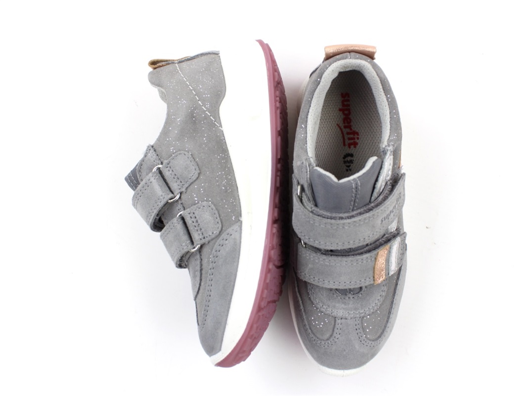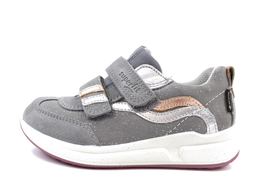 Grå sneakers med sølvfarvede og kobberfarvede detaljer fra Superfit. Skoene lukkes med velcro.