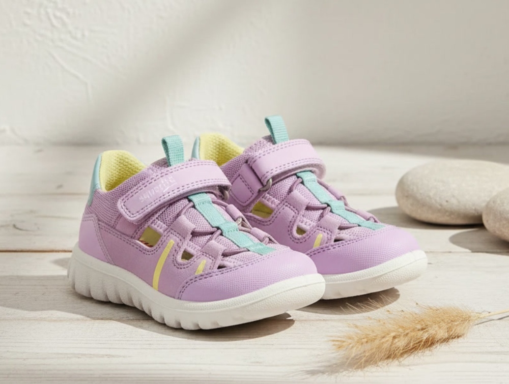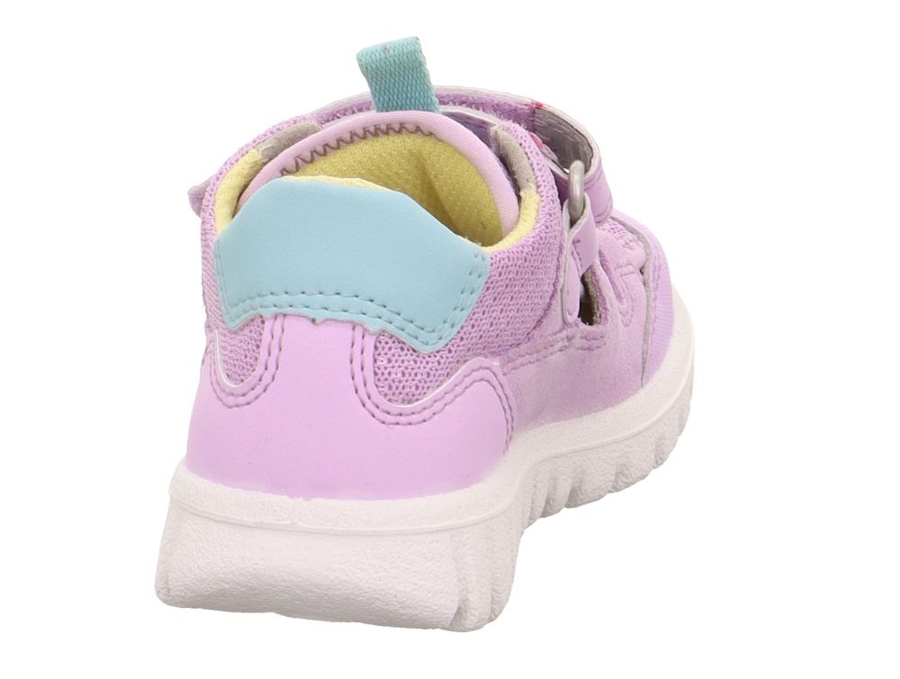 Lilla sandal/åben sko med sporty look og turkise og gule detaljer fra Superfit.