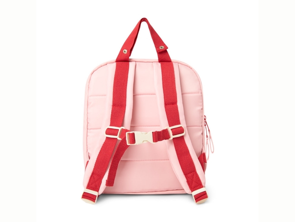 De justerbare skulderremme og klikspændet foran på brystet gør det lettere for barnet at bære tasken på længere ture uden at remmene glider ned af de små skuldre. Fremstillet i 100% genanvendt polyester og nem at tørre af.