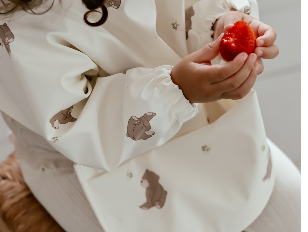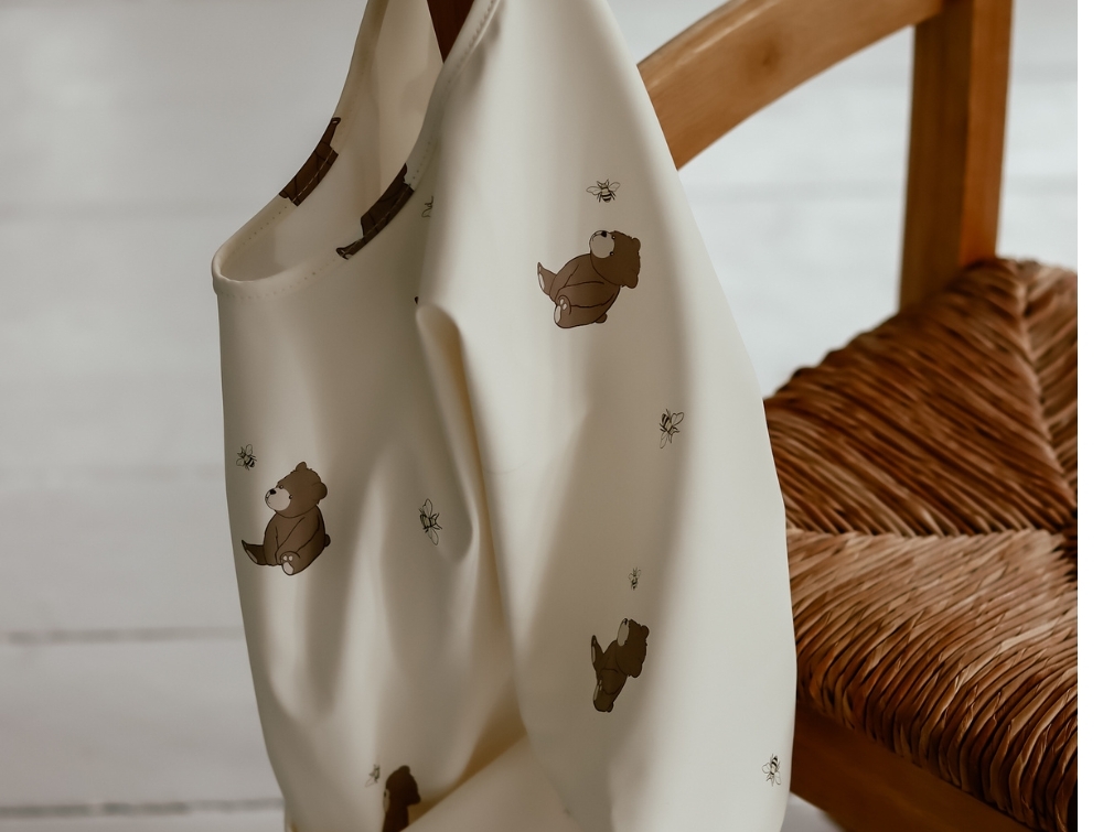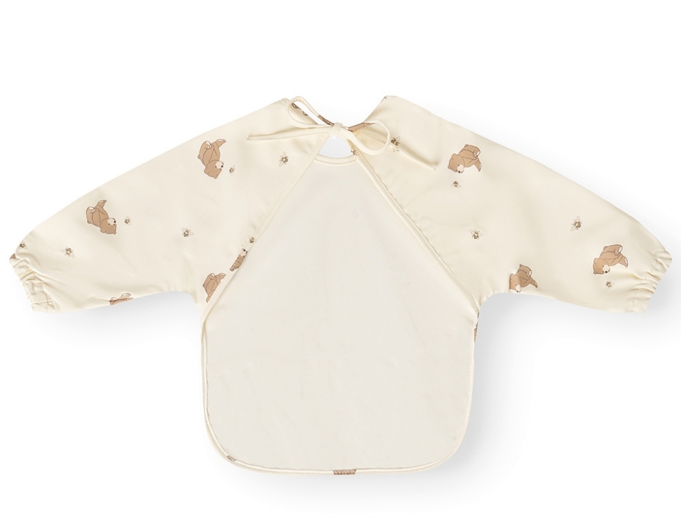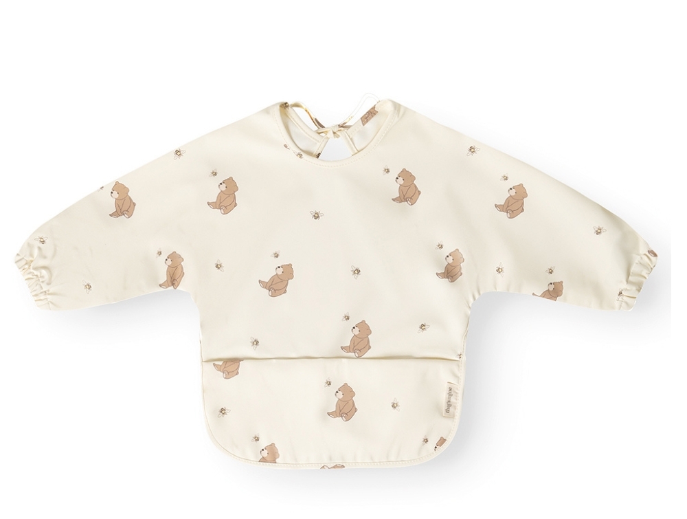 Langærmet hagesmæk i beige nuance (bees and bears) fra That's Mine. Hagesmækken dækker både bryst og arme og har en praktisk opsamlingslomme foran, som fanger madrester og væske.