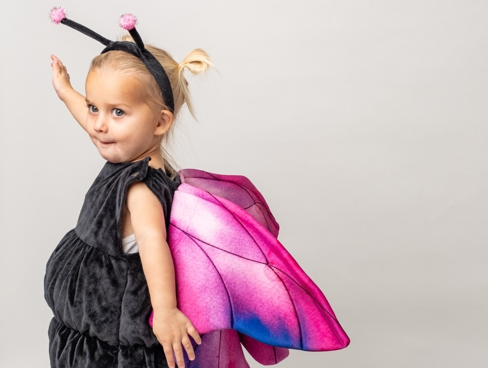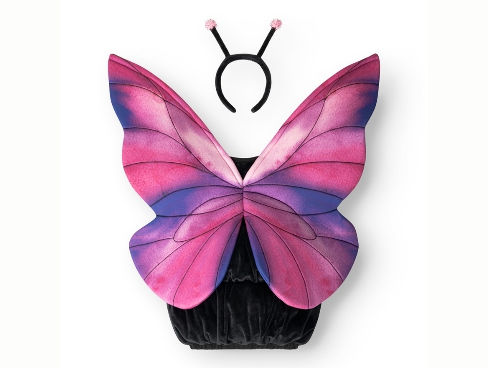 Udklædningsdragt i sort og pink/lilla nuancer (sweet purple) fra That's Mine, formet som en blød og farverig sommerfugl.