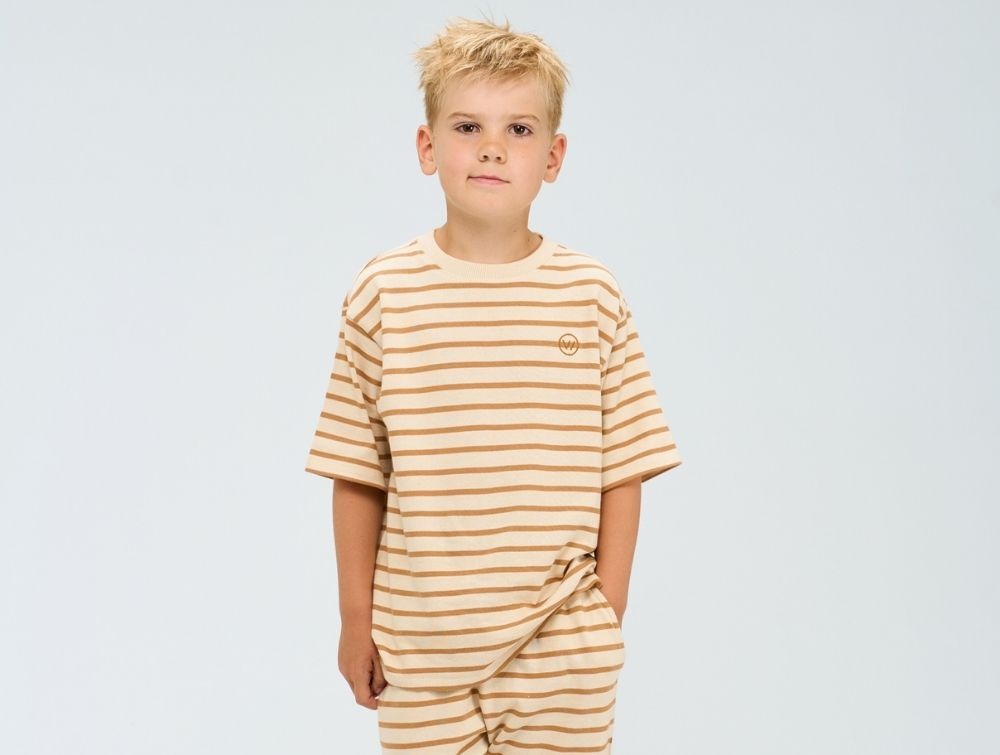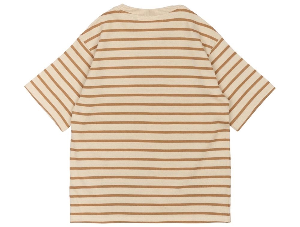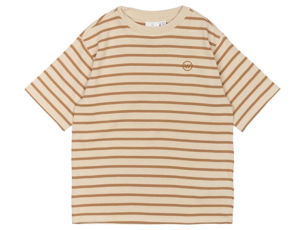 T-shirt med klassiske striber i råhvid og lys brun (indian tan) og et lille, matchende logobroderi på venstre bryst. Modellen har rund hals, korte ærmer og en afslappet, oversized pasform, der falder naturligt på kroppen. Perfekt til hverdagsbrug og nem at kombinere med andre styles – eller fuldend looket med de matchende Nero shorts.