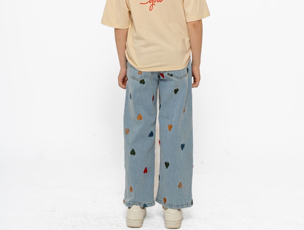 De cool jeans har en afslappet, bred pasform og fine hjertebroderier, der tilføjer et sødt touch. Den lette denimkvalitet gør dem både komfortable og nemme at style til hverdagens outfits.