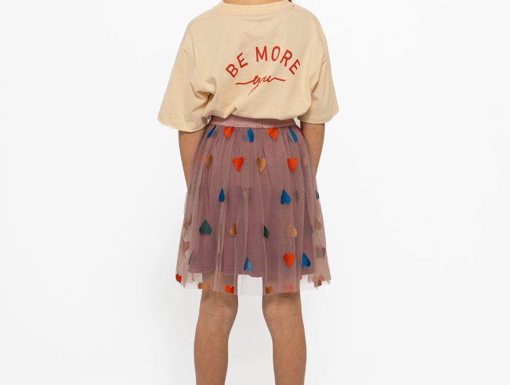 Den fine tyl nederdel har broderede hjerter, der tilføjer et sjovt og legende udtryk. Den lette og luftige kvalitet giver et flot fald, mens den glitrende elastiske talje sikrer en behagelig pasform.