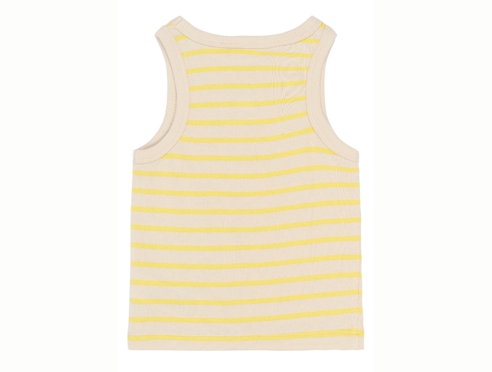Tanktop fra THE NEW med smalle gule og beige striber (acacia striped) og et lille citronbroderi på brystet.