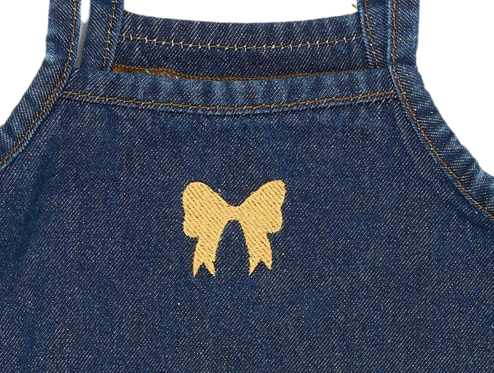 THE NEW siblings denimkjole i medium blue denim med sommerfugl foran  THE NEW siblings denimkjole i medium blue denim med sommerfugl bagpåTHE NEW siblings denimkjole i medium blue denim med sommerfugl -set tæt på